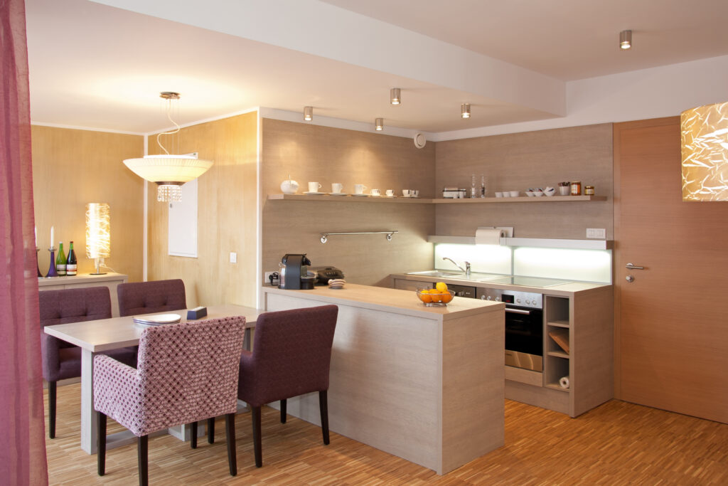 Essbereich, Flat-TV, Fön, Geschirrspüler, großzügiger Balkon, Haartrockner, Internet, kostenfreier Parkplatz, Küche, Kühlschrank, Ledersofa, Minibar, Parkettboden, Safe, Sauna, Wasserkocher, Whirlbadewanne