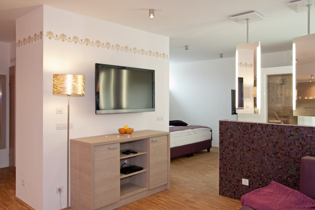 80 Meter vom Hotel Weinresidenz Sonnleitner**** entfernt. Großzügiger Balkon mit Blick ins Dorf, Wohnküche mit Essbereich, Wohnbereich mit Ledersofa, Boxspringbett, Sauna, Dusche, Whirlbadewanne, Fön, 2x Flat-TV, Sat, kostenloser Internetzugang, Klimaanlage – einfach Luxus pur